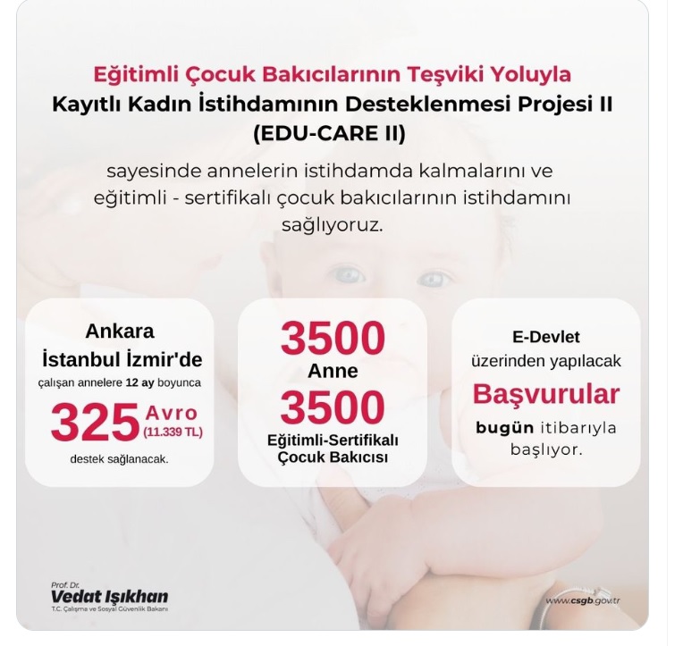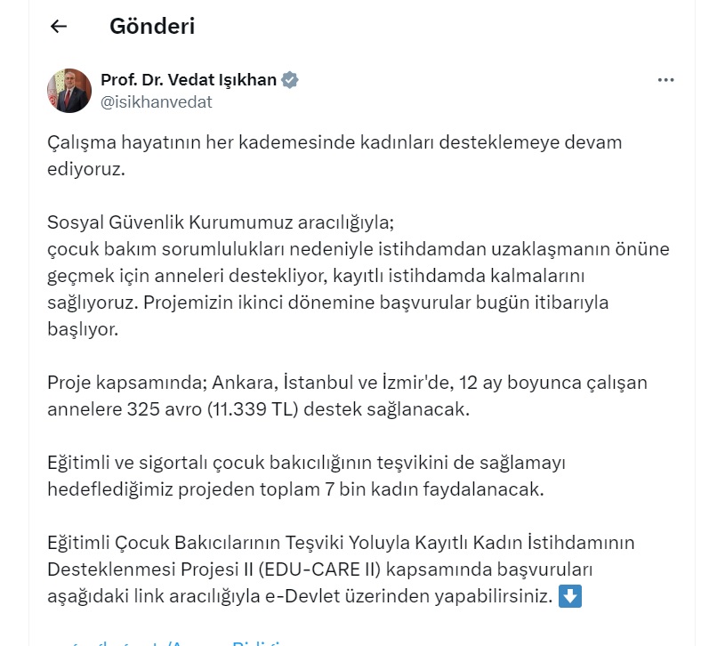 Çalışma ve Sosyal Güvenlik Bakanı Vedat Işıkhan, sosyal medya hesabından yaptığı paylaşımda çalışan annelere yönelik destek programını açıkladı.