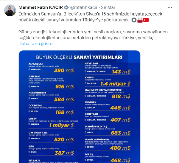 Sanayi ve Teknoloji Bakanı Mehmet Fatih Kacır, "Edirne’den Samsun’a, Bilecik’ten Sivas’a 15 şehrimizde hayata geçecek büyük ölçekli sanayi yatırımlarının Türkiye’ye güç katacağını belirtti.