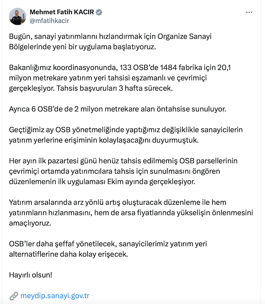 Bakan Kacır açıklamasında şu ifadeleri kullandı: "Bugün, sanayi yatırımlarını hızlandırmak için organize sanayi bölgelerinde yeni bir uygulama başlatıyoruz. Sanayi ve Teknoloji Bakanlığımız koordinasyonunda 133 organize sanayi bölgesinde 1484 fabrika için 20,1 milyon metrekare yatırım yeri tahsisi eş zamanlı ve çevrim içi gerçekleşiyor. Tahsis başvuruları 3 hafta devam edecek. Ayrıca 6 organize sanayi bölgesinde de 2 milyon metrekare alan ön tahsise sunuluyor. Geçtiğimiz ay organize sanayi bölgesi yönetmeliğinde yaptığımız değişiklikle sanayicilerin yatırım yerlerine erişiminin kolaylaşacağını duyurmuştuk. Her ayın ilk pazartesi günü henüz tahsis edilmemiş OSB parsellerinin çevrim içi ortamda yatırımcılara tahsis için sunulmasını öngören düzenlemenin ilk uygulaması ekim ayında gerçekleşiyor. Yatırım arsalarında arz yönlü artış oluşturacak düzenlemeyle hem yatırımların hızlanmasını hem de arsa fiyatlarında yükselişin önlenmesini amaçlıyoruz. Organize sanayi bölgeleri daha şeffaf yönetilecek, sanayicilerimiz yatırım yeri alternatiflerine daha kolay erişecek"