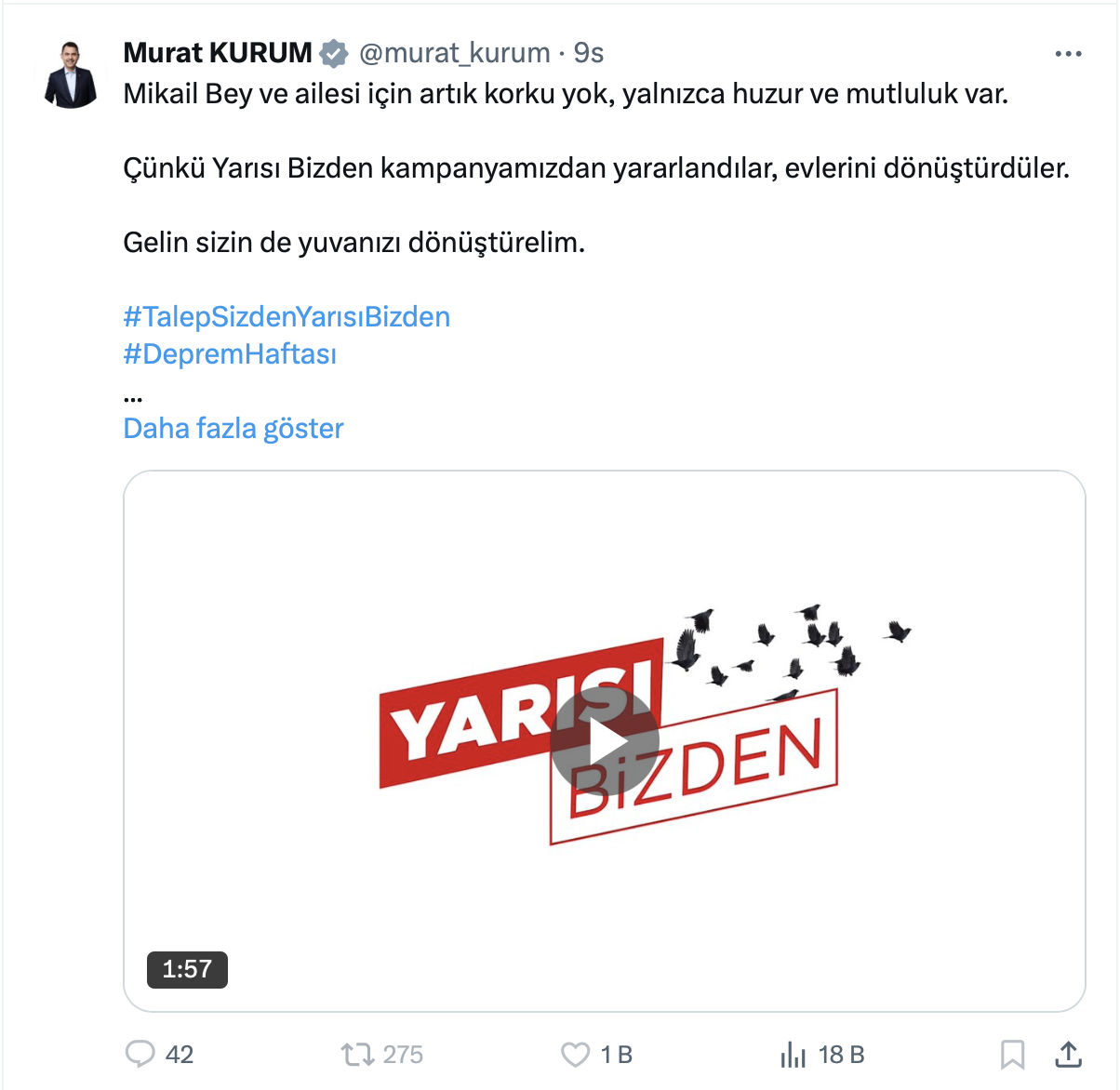 Çevre, Şehircilik ve İklim Değişikliği Bakanı Murat Kurum, sosyal medya hesabı https://x.com/murat_kurum üzerinden Zeytinburnu'nda yenilenen evlerine taşınan vatandaşların görüntülerini paylaşarak, "Mikail Bey ve ailesi için artık korku yok, yalnızca huzur ve mutluluk var. Çünkü Yarısı Bizden kampanyamızdan yararlandılar, evlerini dönüştürdüler. Gelin sizin de yuvanızı dönüştürelim." Dedi.