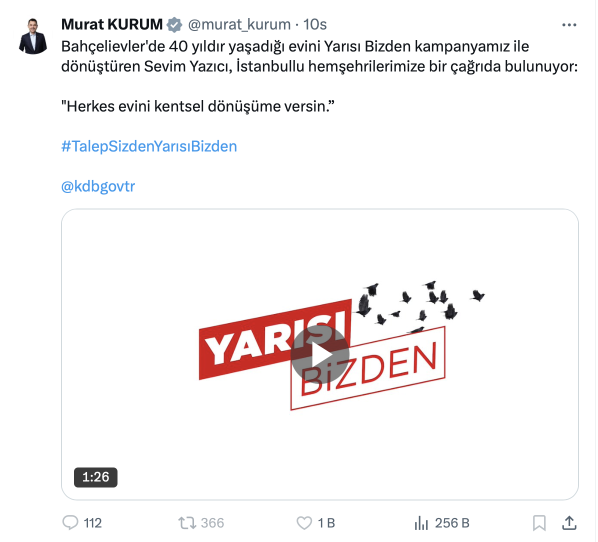 Konu ile ilgili olarak verilen detaylara göre Çevre, Şehircilik ve İklim Değişikliği Bakanı Murat Kurum, resmi sosyal medya hesabı üzerinden https://x.com/murat_kurum üzerinden "Bahçelievler'de 40 yıldır yaşadığı evini 'Yarısı Bizden' kampanyamız ile dönüştüren Sevim Yazıcı, İstanbullu hemşehrilerimize bir çağrıda bulunuyor: Herkes evini kentsel dönüşüme versin." ifadeleriyle aptığı paylaşımda, Yazıcı'nın hikayesine yer verdi.