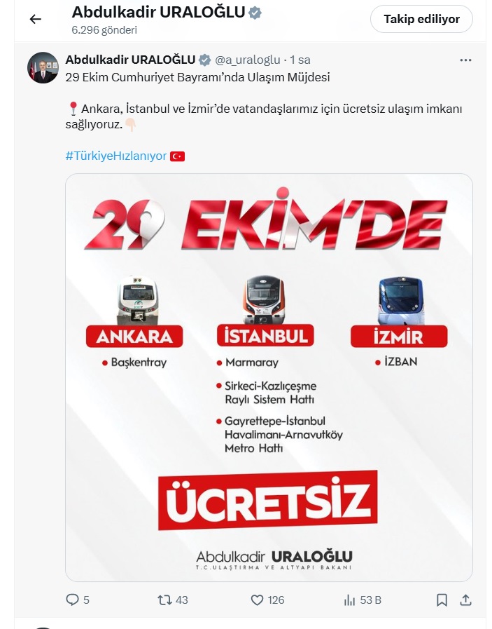 Ulaştırma ve Altyapı Bakanı Abdulkadir Uraloğlu, 29 Ekim Cumhuriyet Bayramı'nda, Bakanlığına bağlı Marmaray, Başkentray, İZBAN, Sirkeci-Kazlıçeşme raylı sistem hattı ve Gayrettepe-İstanbul Havalimanı-Arnavutköy metro hattının ücretsiz hizmet vereceğini ifade edildi.