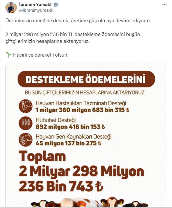 Yumaklı, sosyal medya hesabından, destekleme ödemeleri ile ilgili son dakika açıklamasında bulundu. İşte Bakan Yumaklı'nın o açıklaması...