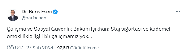 Ancak beklenen olmadı, Çalışma ve Sosyal Güvenlik Bakanı Vedat Işıkhan'dan "Staj sigortası ve kademeli emeklilikle ilgili bir çalışmamız yok" açıklaması geldi.