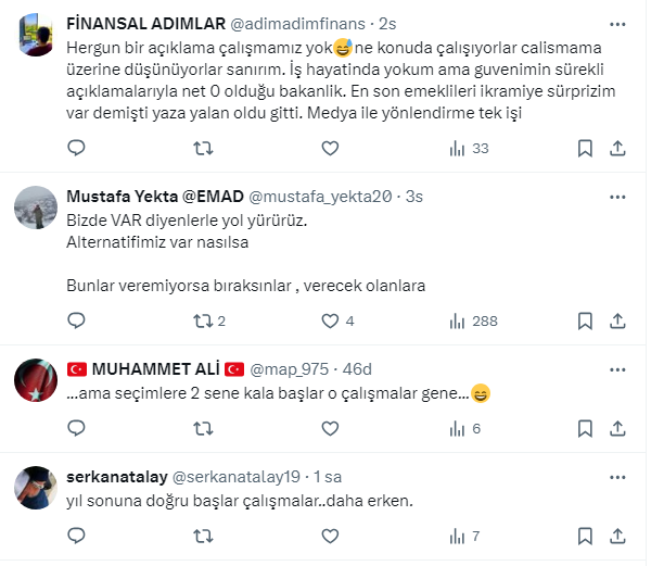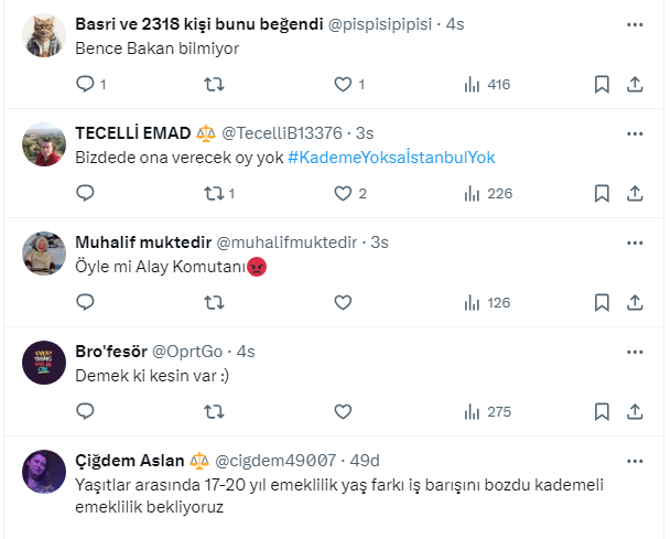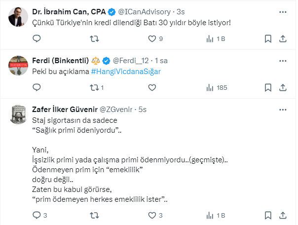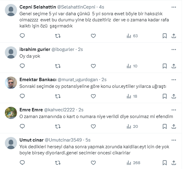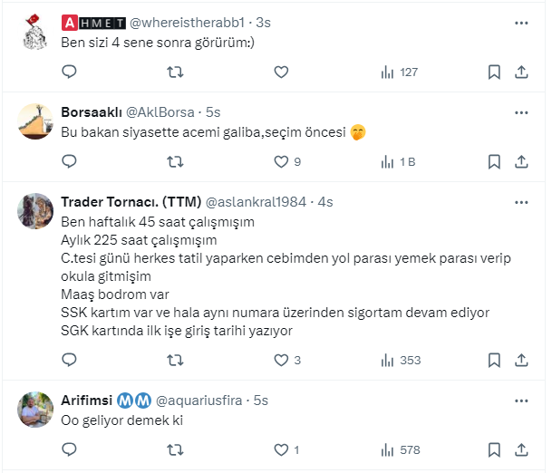 Bakan Vedat Işıkhan’ın açıklamasını Gazeteci Barış Esen,http:// https://twitter.com/barisesen X sosyal medya hesabından paylaştı. Vatandaş, emeklilikle ilgili yapılan açıklamanın çalışma barışını engelleyeceğini belirterek tepkisini dile getirdi.