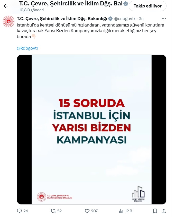 Paylaşımda, "İstanbul'da kentsel dönüşümü hızlandıran, vatandaşımızı güvenli konutlara kavuşturacak Yarısı Bizden Kampanyamızla ilgili merak ettiğiniz her şey burada." ifadesiyle kampanyanın animasyon videosu yayımlandı.
