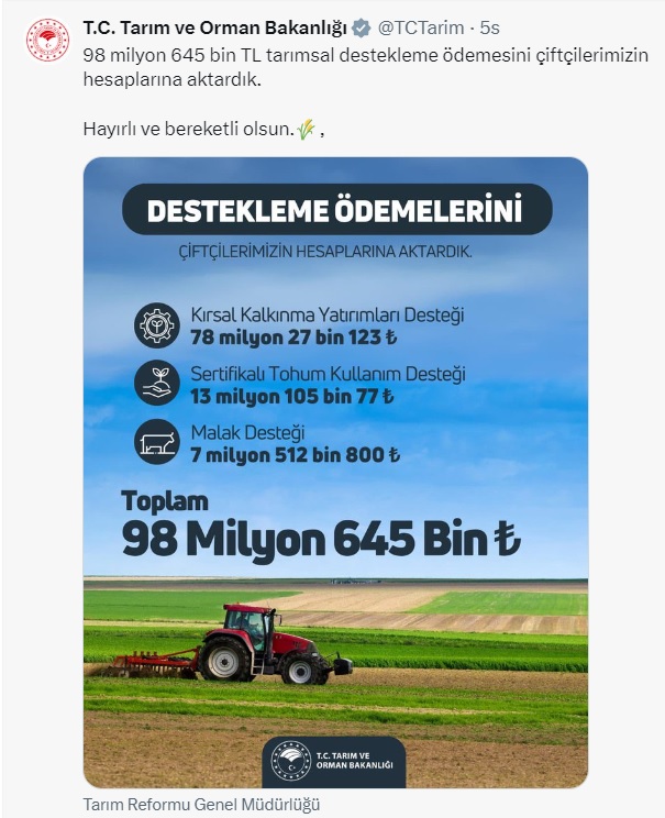 Bakanlığın sosyal medya hesabı X'ten, yaptığı açıklamada tarımsal destekleme ödemelerine ilişkin paylaşım yapıldığı kaydedildi.