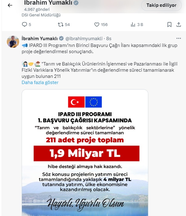 "IPARD III Programı 1. Başvuru Çağrı İlanı" kapsamındaki ilk grup proje değerlendirmesinin sonuçlandığını belirten Yumaklı şu ifadeleri kullandı: "IPARD III Programı'nın Birinci Başvuru Çağrı İlanı kapsamındaki ilk grup proje değerlendirmesi sonuçlandı.