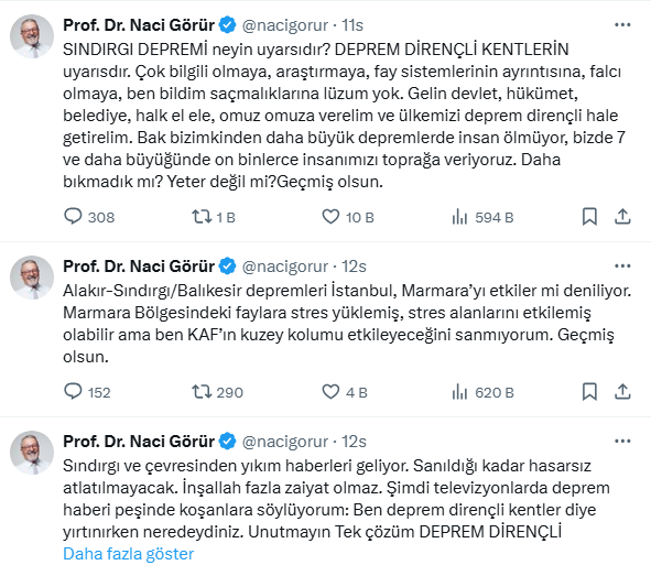Görür, sosyal medya hesabı X'ten 'Alakır-Sındırgı/Balıkesir depremleri İstanbul, Marmara’yı etkiler mi deniliyor. Marmara Bölgesindeki faylara stres yüklemiş, stres alanlarını etkilemiş olabilir ama ben KAF’ın kuzey kolumu etkileyeceğini sanmıyorum. Geçmiş olsun.' açıklamasını yaptı.