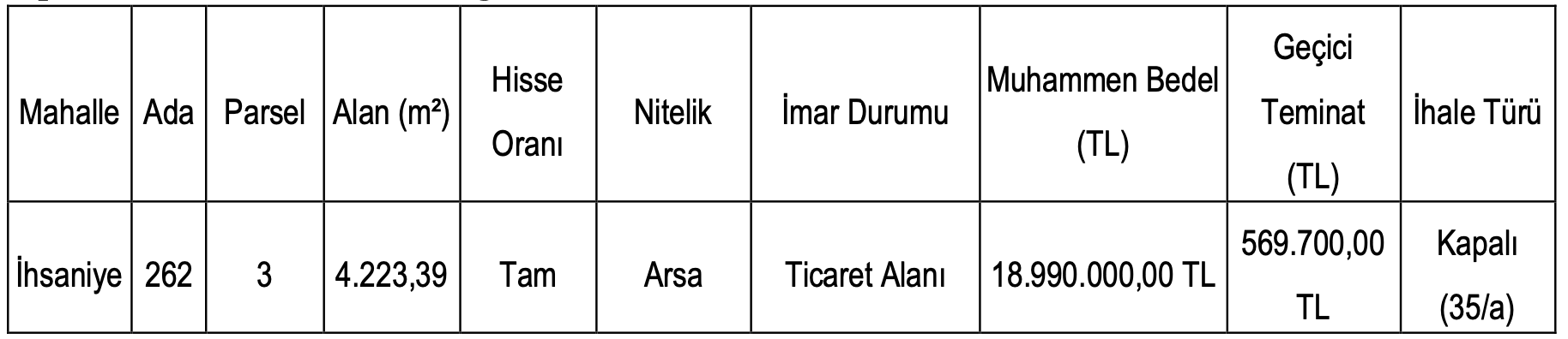 Mülkiyeti Belediyemize ait 1 adet, aşağıda niteliği, ada, parsel numarası, imar durumu ile toplam muhammen bedeli ve geçici teminat tutarı belirtilen taşınmazın satış ihalesi işidir.