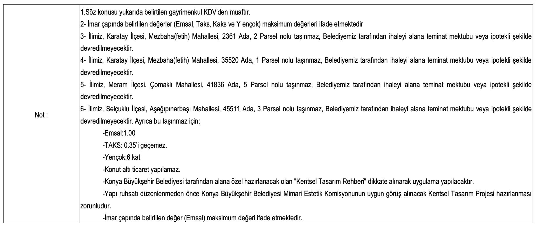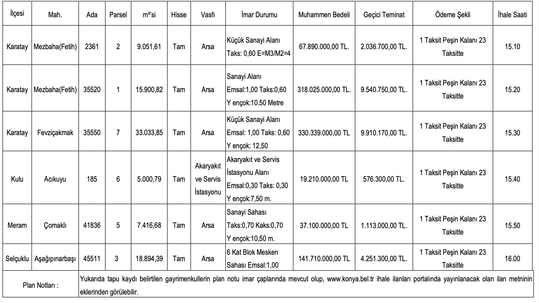 Konya’da yer alan beş adet arsanın yüz ölçümleri 7 bin 416,68 metrekare ile 33 bin 33,85 metrekare arasında değişiyor.