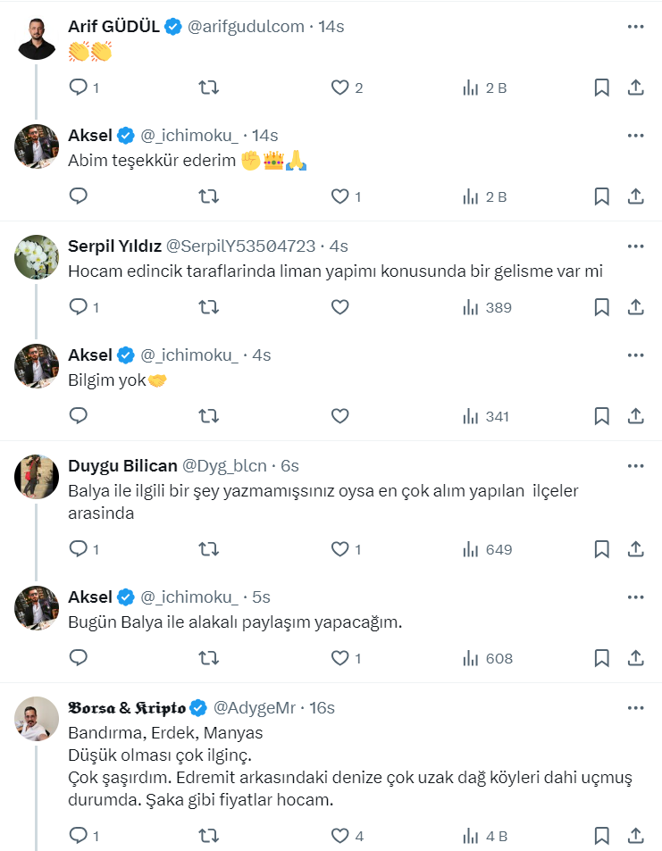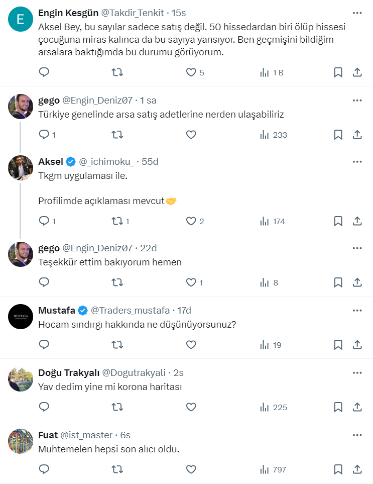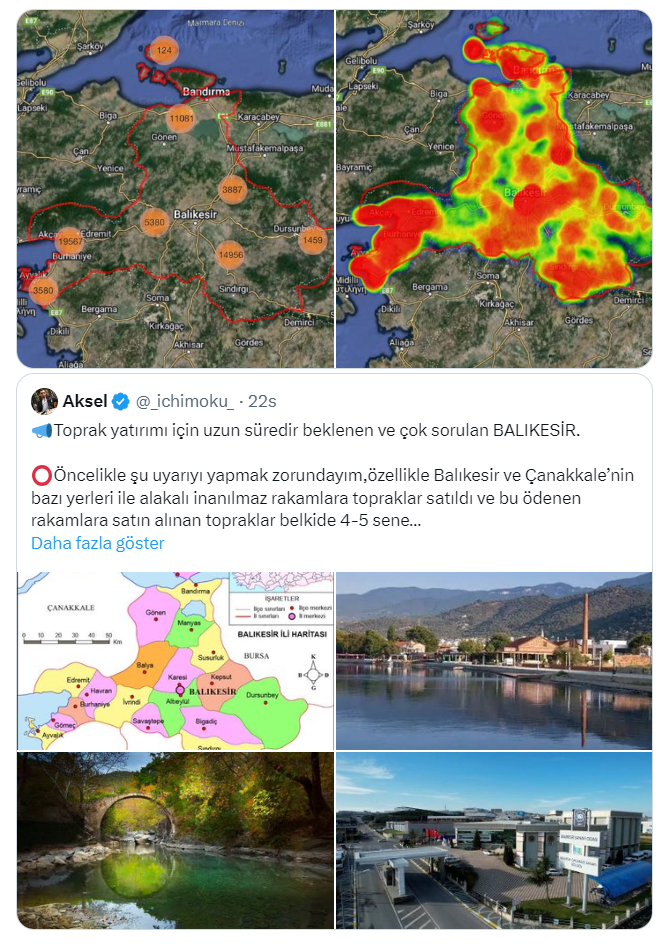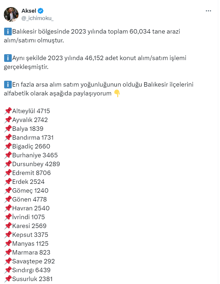 Toprak yatırımcısı ve danışmanı 40,1 bin takipçili Aksel isimli kullanıcı, https://twitter.com/_ichimoku_ X sosyal medya hesabından arsa ve arazi yatırımı ile ilgili bir paylaşım yaptı. Paylaşımında 2023 yılında toplam 60,034 tane arazi alım/satımı olduğunu belirten Aksel ayrıca alım satımın en yoğun olduğu ilçeleri de açıkladı.