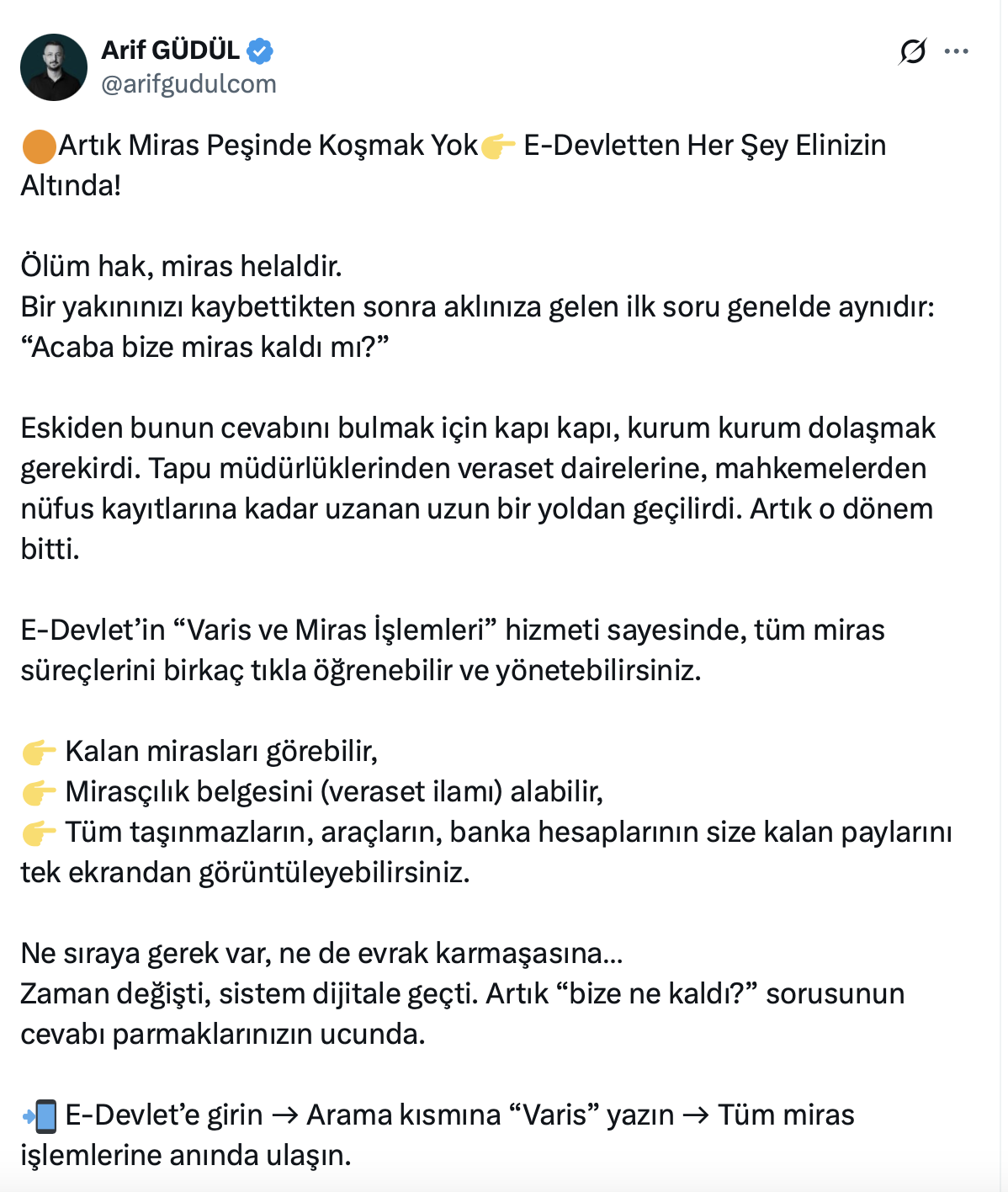 Arif Güdül resmi X hesabı https://x.com/arifgudulcom üzerinden yaptığı paylaşımda, “E-Devlet’in “Varis ve Miras İşlemleri” hizmeti sayesinde, tüm miras süreçlerini birkaç tıkla öğrenebilir ve yönetebilirsiniz.” Ifadelerini kullandı.