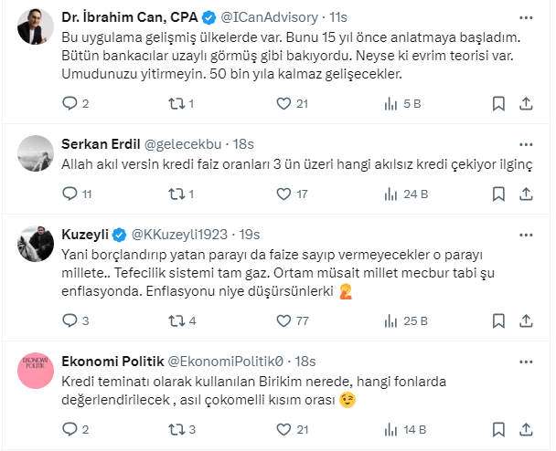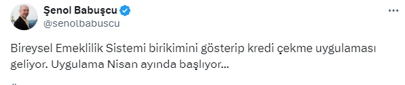 Vatandaş bankalardan eli boş dönmeyecek. Krediye başvurup da alamayanlara müjdeli haber geldi. Bankalar kredi musluklarını açtı, Ziraat Bankası eski Genel Müdür Yardımcısı, ekonomist Şenol Babuşçu https://twitter.com/senolbabuscu X sosyal medya hesabından yaptığı paylaşımda, “Bireysel Emeklilik Sistemi birikimini gösterip kredi çekme uygulaması geliyor. Uygulama Nisan ayında başlıyor...” dedi.