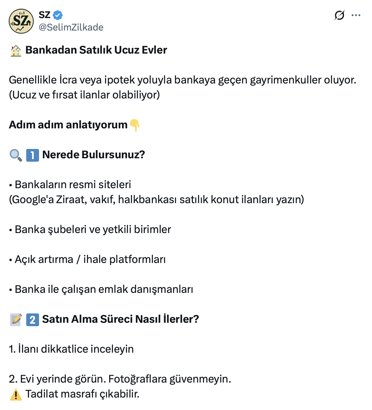 Emlak ve gayrimenkul sektörü ile ilgili yaptığı paylaşımlarla dikkat çeken Bilgisayar Mühendisi Selim Zilkade resmi X hesabı https://x.com/SelimZilkade üzerinden yaptığı paylaşımda bankalardan nasıl ucuz ev alınabileceğini anlattı.