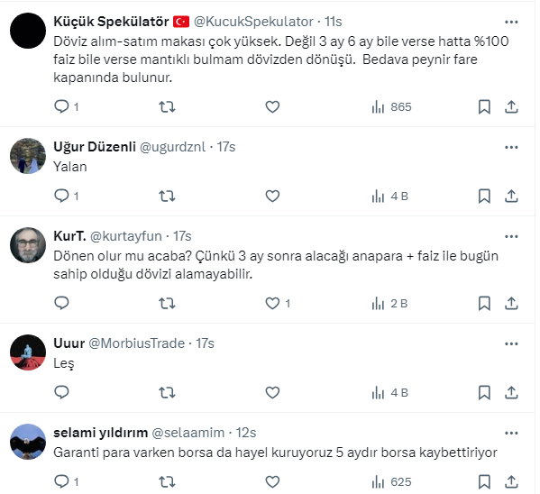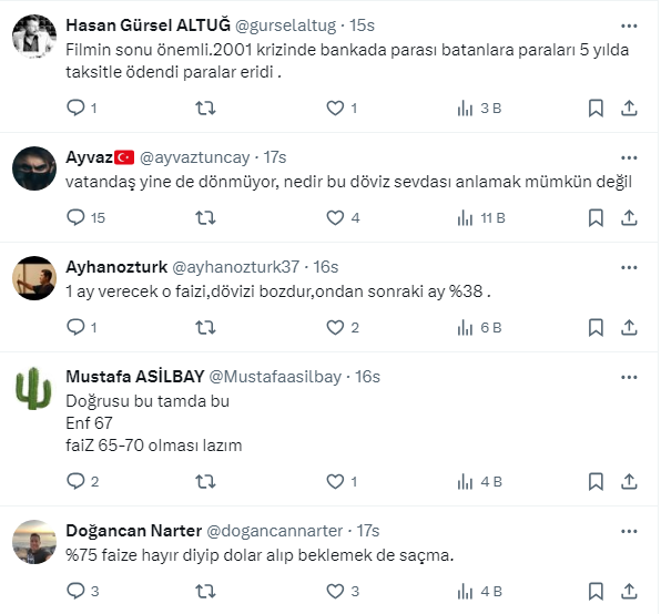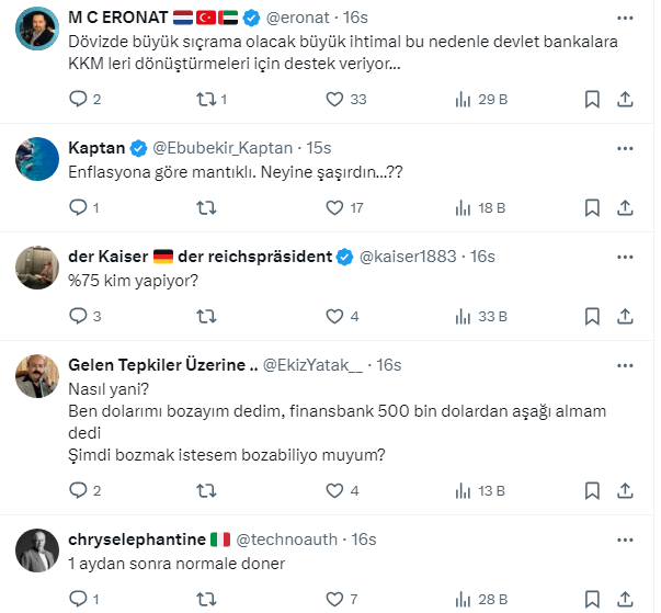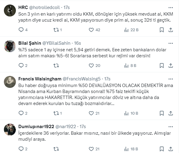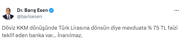 Vatandaşın parasını ne şekilde değerlendireceği ile ilgili kafası iyice karışırken, Gazeteci Barış Esen https://twitter.com/barisesen X sosyal medya hesabından dikkat çeken bir paylaşım yaptı. Esen yaptığı paylaşımda, bazı bankaların KKM dönüşü için mevduat faizi tekliflerini yüzde 75’e çıkardığını şöyle duyurdu: “Döviz KKM dönüşünde Türk Lirasına dönsün diye mevduata % 75 TL faizi teklif eden banka var… İnanılmaz.” Bu paylaşım üzerine bazı takipçileri bunun dolarda yukarı yönlü patlamanın işareti olduğunu söyledi.