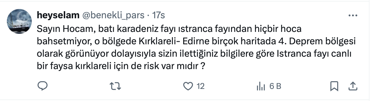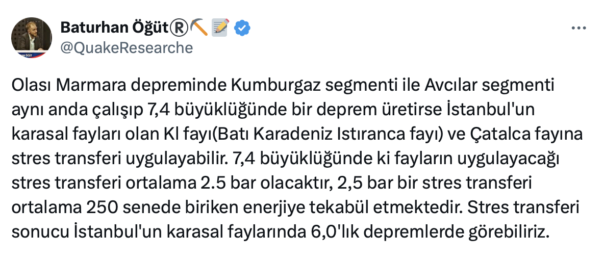 Baturhan Öğüt, yaptığı paylaşımda “İstanbul'un karasal faylarında 6,0'lık depremler görebiliriz” dedi.
