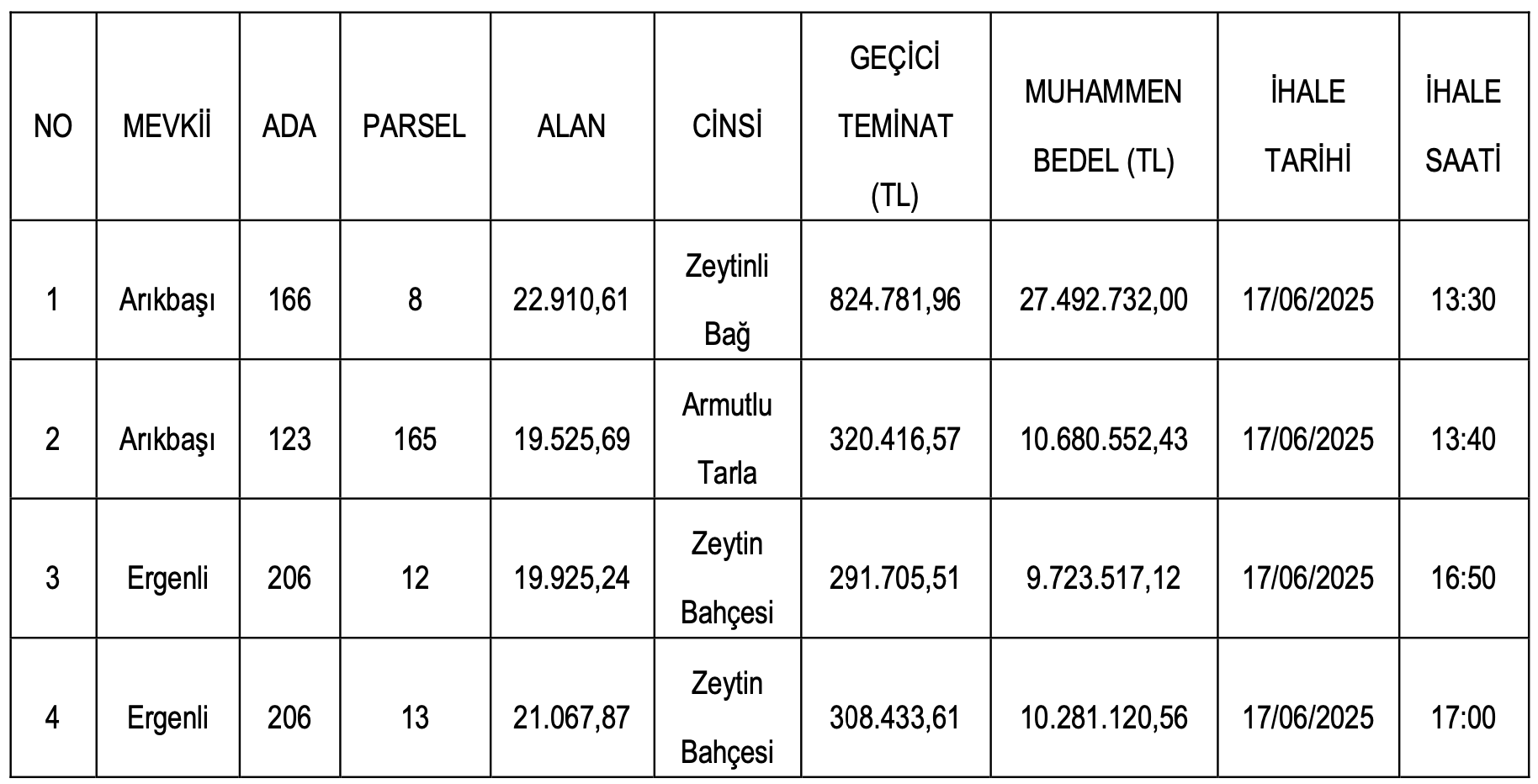 Arıkbaşı ve Ergenli’de yer alan gayrimenkullerin yüz ölçümleri 19 bin 525,69 metrekare ile 22 bin 910,61 metrekare arasında değişiyor.