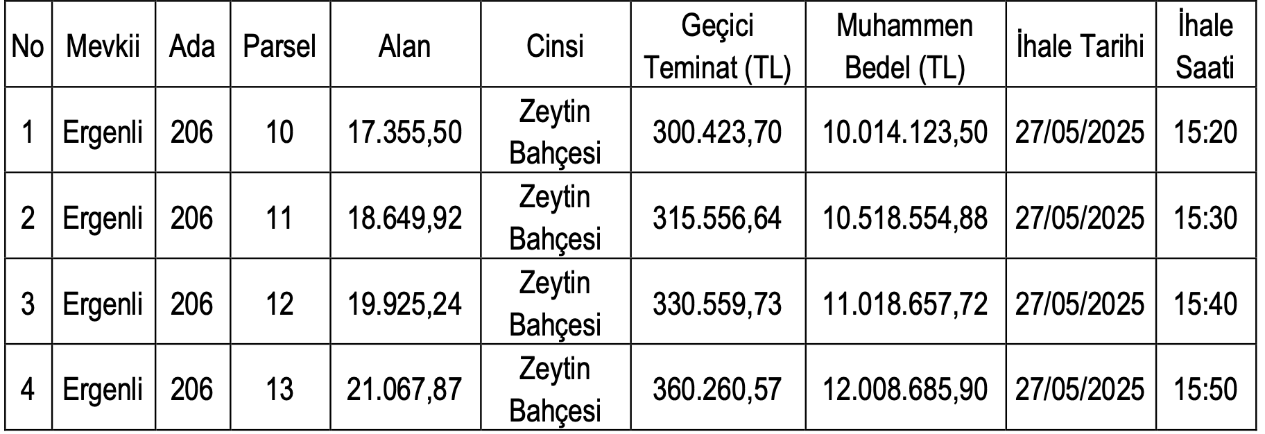 Zeytin bahçelerinin muhammen bedelleri 10 milyon 14 bin 123,50 TL ile 12 milyon 8 bin 685,90 TL arasında farklılık gösterirken geçici teminat bedelleri ise 300 bin 423,70 TL ile 360 bin 260,57 TL arasında farklılık gösteriyor.