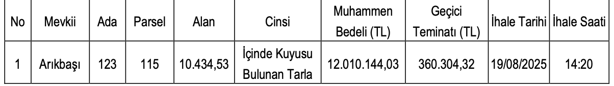 Söz konusu arazinin muhammen bedeli 12 milyon 10 bin 144,03 TL şeklinde açıklanırken, geçici teminat bedeli ise 360 bin 304,32 TL olarak açıklandı.