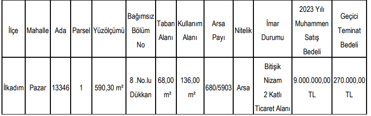 1- Samsun Büyükşehir Belediye Meclisinin 14.04.2023 tarih ve 2-1-146 sayılı kararı gereği; İlimiz İlkadım İlçesi, Pazar Mahallesi, 13346 Ada, 1-2 ve 3 no.lu Parsellerde kayıtlı “Arsa” vasıflı taşınmazların üzerine bir bütün halinde inşa edilen binada, aşağıdaki tabloda İlçesi, Mahallesi, Ada No.su, Parsel No.su, Yüzölçümü, Bağımsız Bölüm No.su, Taban Alanı, Kullanım Alanı, Arsa Payı, Niteliği, İmar Durumu, Muhammen Satış Bedeli ve Geçici Teminat Bedeli belirtilen ve 8 no.lu dükkana isabet eden; İlimiz İlkadım İlçesi, Pazar Mahallesi, 13346 ada 1