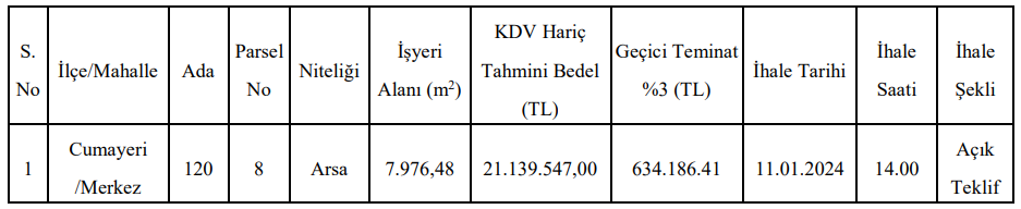 Düzce İli Cumayeri Belediye Başkanlığı, Düzce Cumayeri'nde yer alan arsayı satışa çıkardı.