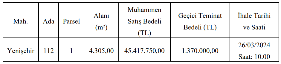 Hatay ve Kayseri'de yer alan arsa ve iş yeri için satış ihalesi düzenleniyor. Hatay'da yer alan arsanın muhammen bedeli 45 milyon 417 bin 750 TL olarak açıklanırken geçici teminat bedeli ise 1 milyon 370 bin TL olarak açıklandı.