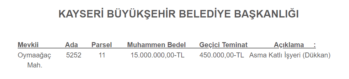 Kayseri'de yer alan iş yerinin ise muhammen bedeli 15 milyon TL olarak açıklanırken, geçici teminat bedeli de 450 bin TL olarak açıklandı.