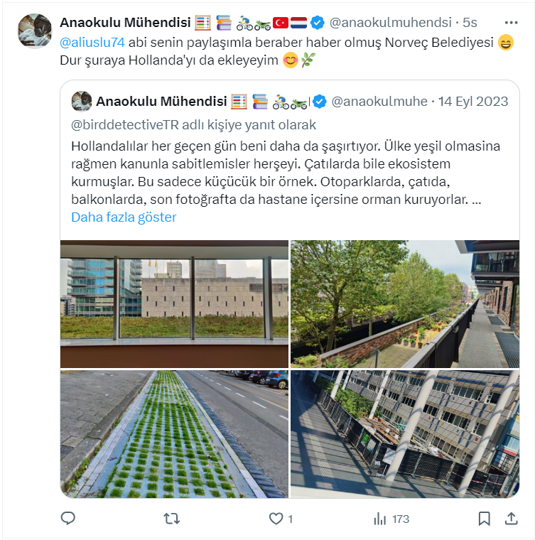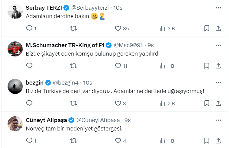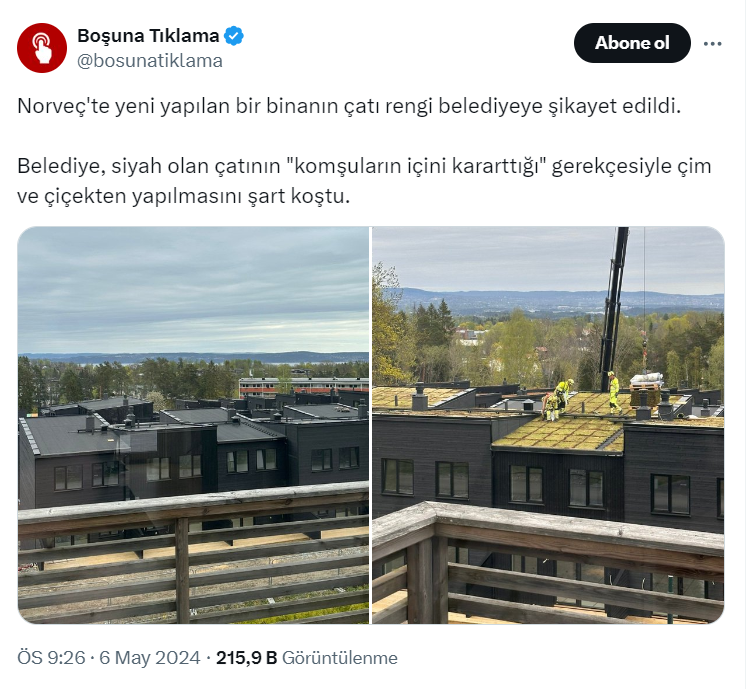 X Sosyal Medya’da 997,1 bin takipçili twitter.com/bosunatiklama Boşuna Tıklama hesabı, "Belediye Norveç'teki binanın çatısı için 'komşuların içini kararttığı' gerekçesiyle çim ve çiçekten yapılmasını şart koştu" haberini şu ifadelerle “Norveç'te yeni yapılan bir binanın çatı rengi belediyeye şikayet edildi. Belediye, siyah olan çatının "komşuların içini kararttığı" gerekçesiyle çim ve çiçekten yapılmasını şart koştu.”