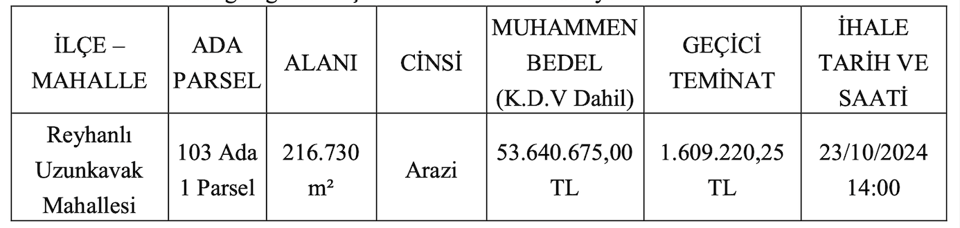Arazinin satış ihalesi 23 Ekim 2024 tarihinde saat 14.00’te Reyhanlı Belediye Başkanlığı Meclis Salonunda toplanan Encümen huzurunda yapılacak.
