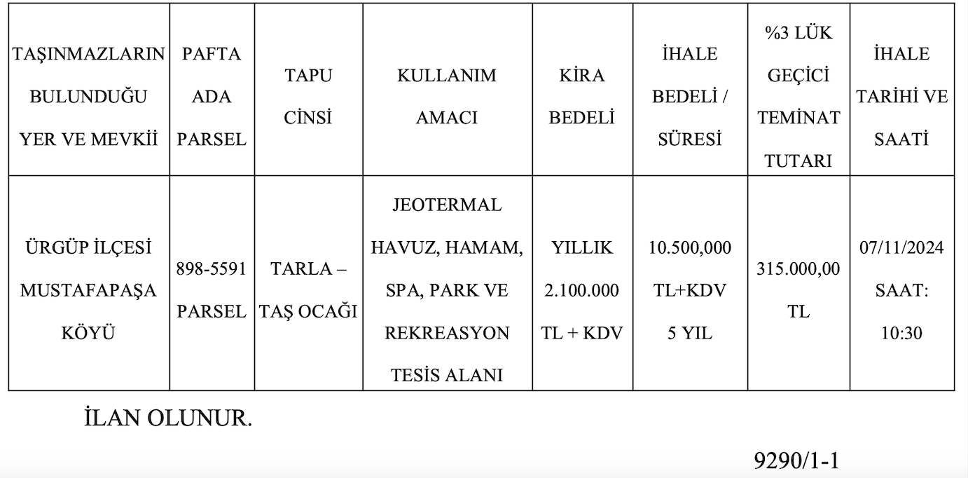 Nevşehir İl Özel İdaresi Nevşehir Ürgüp’te yer alan gayrimenkul için kiralama ihalesi düzenliyor. Kullanım amacı jeotermal havuz, hamam, SPA, park ve rekreasyon tesis alanı alanı olarak belirtilen gayrimenkul 5 yıllığına kiraya verilecek.