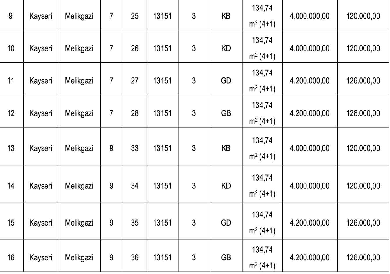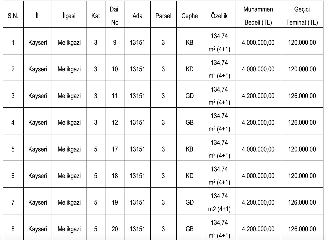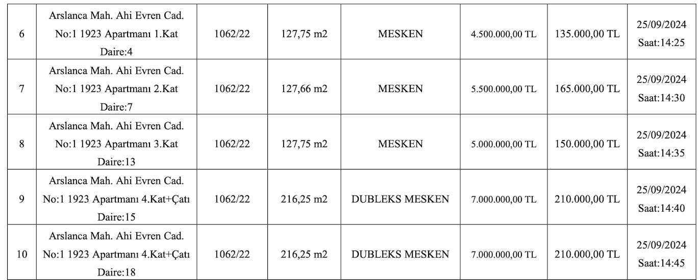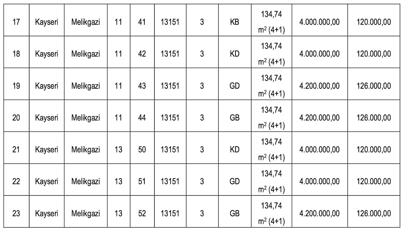 Satışa çıkarılan konutların muhammen bedelleri 4 milyon 500 bin TL ve 14 milyon 500 bin TL arasında değişirken, geçici teminat bedelleri de 135 bin TL ile 435 bin TL arasında değişiyor.