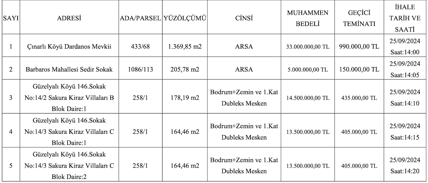 10 (on) adet taşınmaz, Çanakkale Belediyesi meclis salonunda 2886 sayılı Devlet İhale Kanunu’nun 35.maddesinin (a) bendine göre Kapalı Teklif Usulü ile