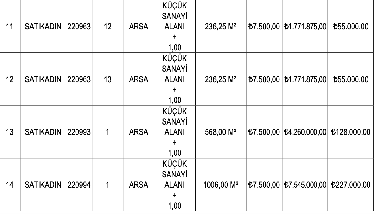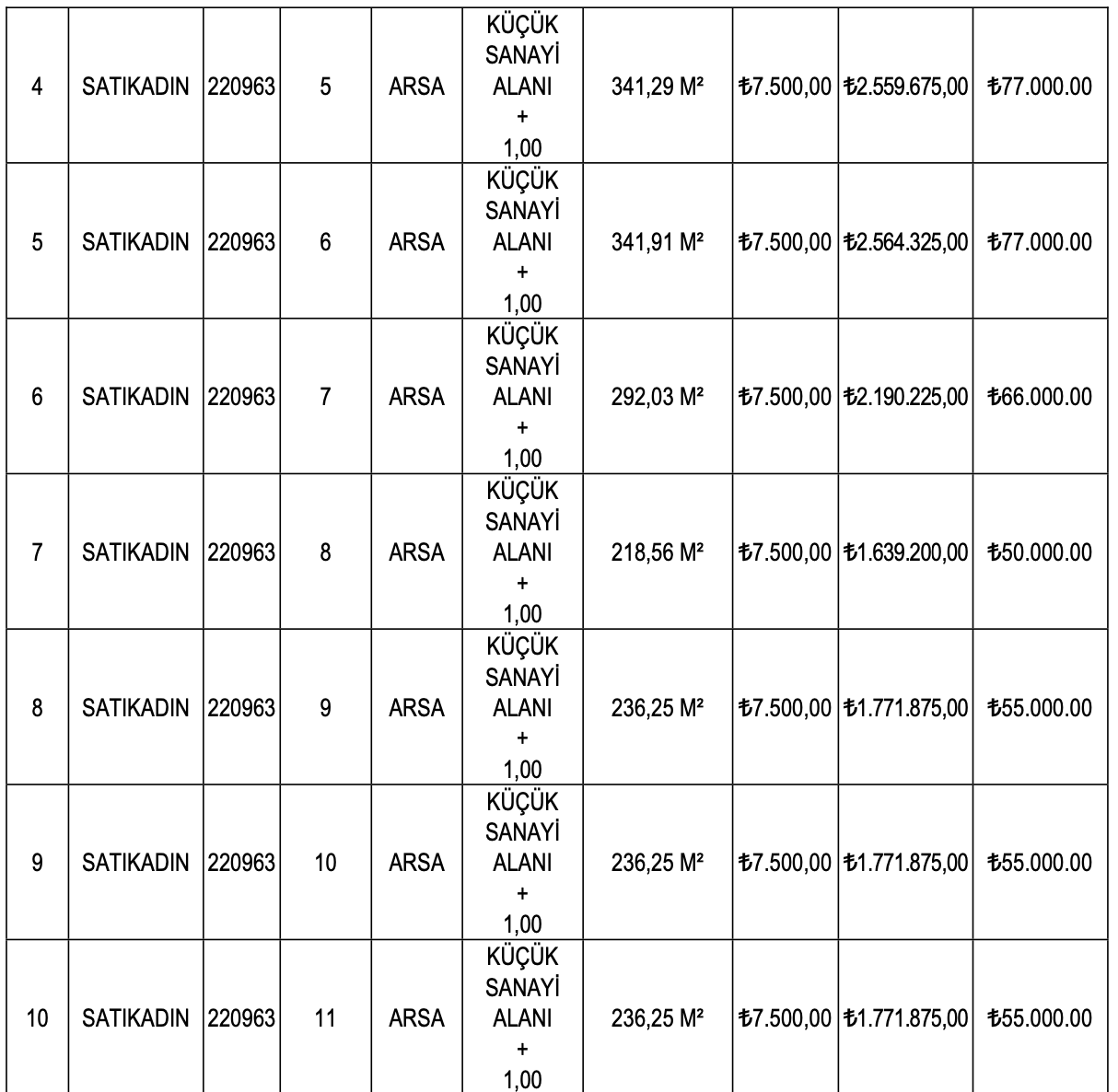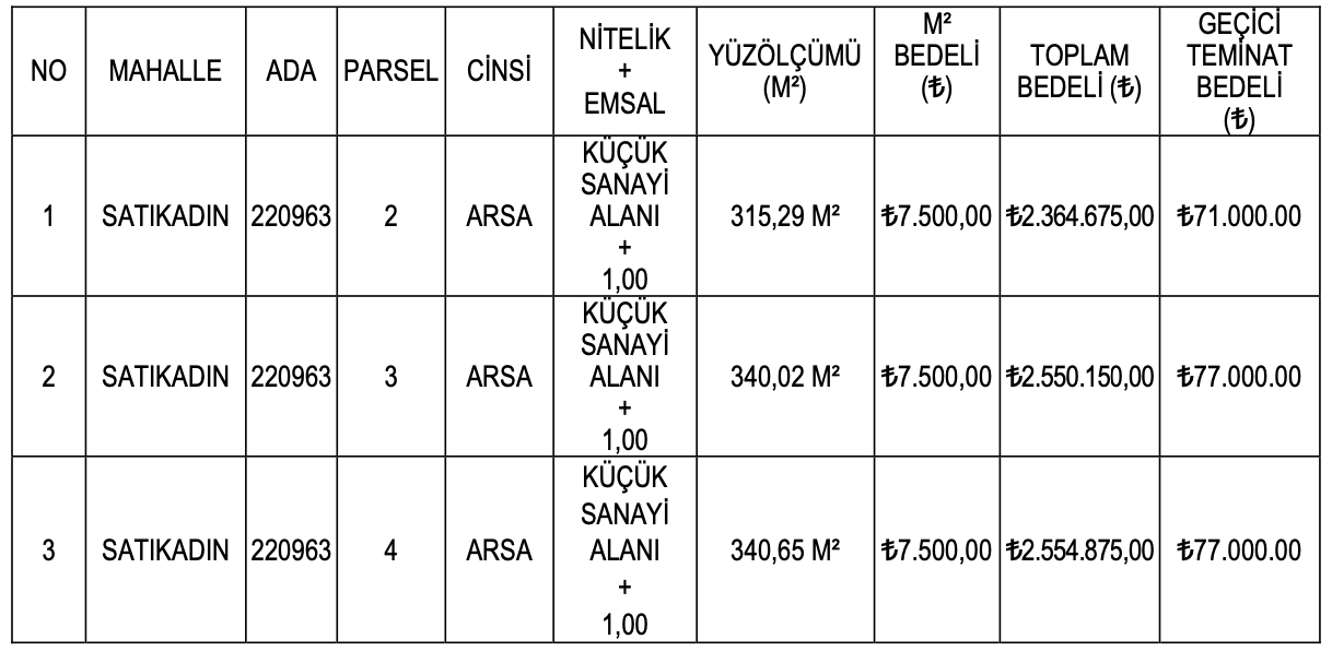 Küçük sanayi alanı imarlı arsaların muhammen bedelleri 1 milyon 639 bin 200 TL ile 7 milyon 545 bin TL arasında farklılık gösterirken, geçici teminat bedelleri ise 50 bin TL ile 227 bin TL arasında farklılık gösteriyor.
