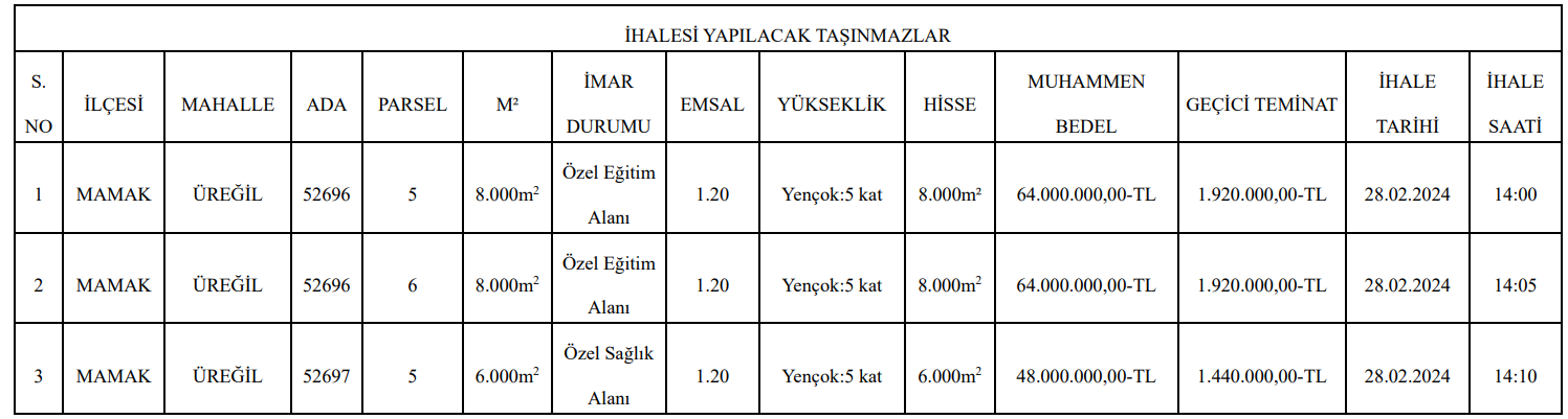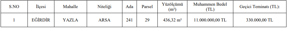 Ankara ve Isparta'da yer alan 4 adet arsa için satışa çıkarıldı. Ankara'da yer alan özel eğitim alanı imarlı arsaların muhammen bedelleri 48 milyon TL ve 64 milyon TL olarak açıklanırken, Isparta'da yer alan arsanın satış bedeli ise 11 milyon TL olarak açıklandı.