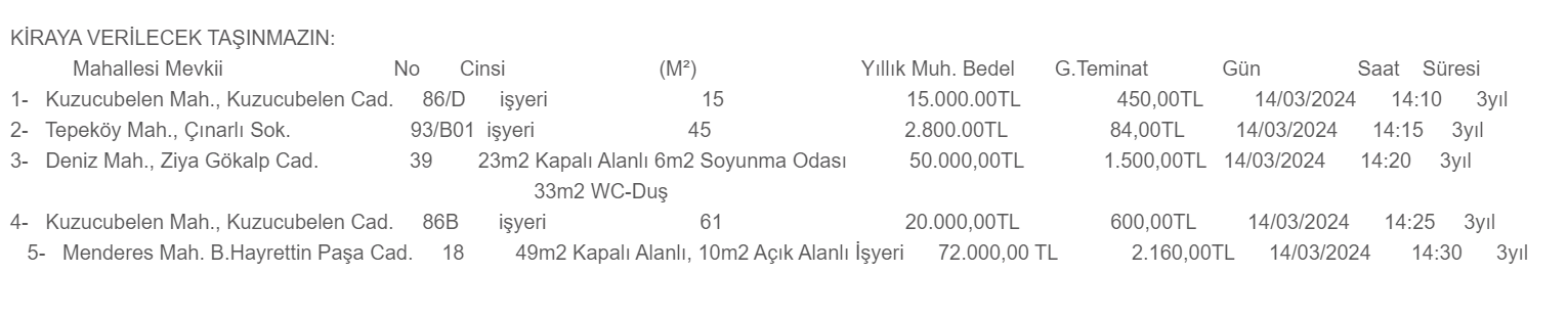 Mersin Mezitli'de yer alan iş yerlerinin kira bedeli ise 2 bin 800 TL ile 72 bin TL arasında değişirken, geçici teminat bedelleri ise 84 TL ile 2 bin 160 TL arasında değişiyor.