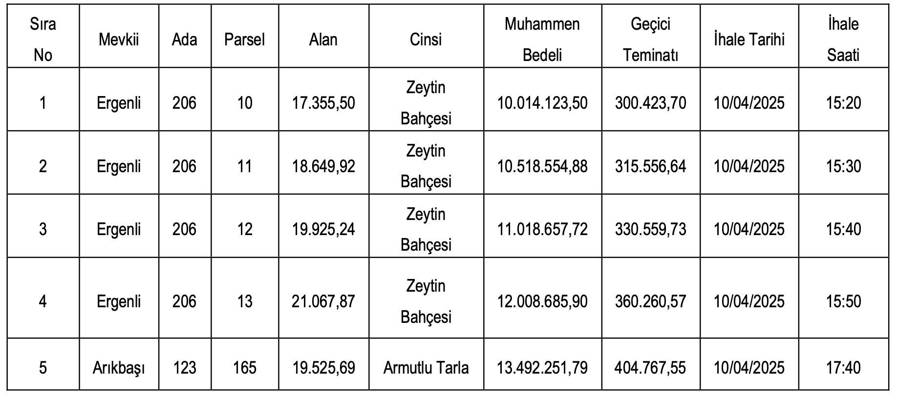 Ergenli ve Arıkbaşı mahallelerinde yer alan arazi ve zeytin bahçelerinin satış ihaleleri 10 Nisan 2025 tarihinde saat 15.20 ile 17.40 arasında yapılacak.