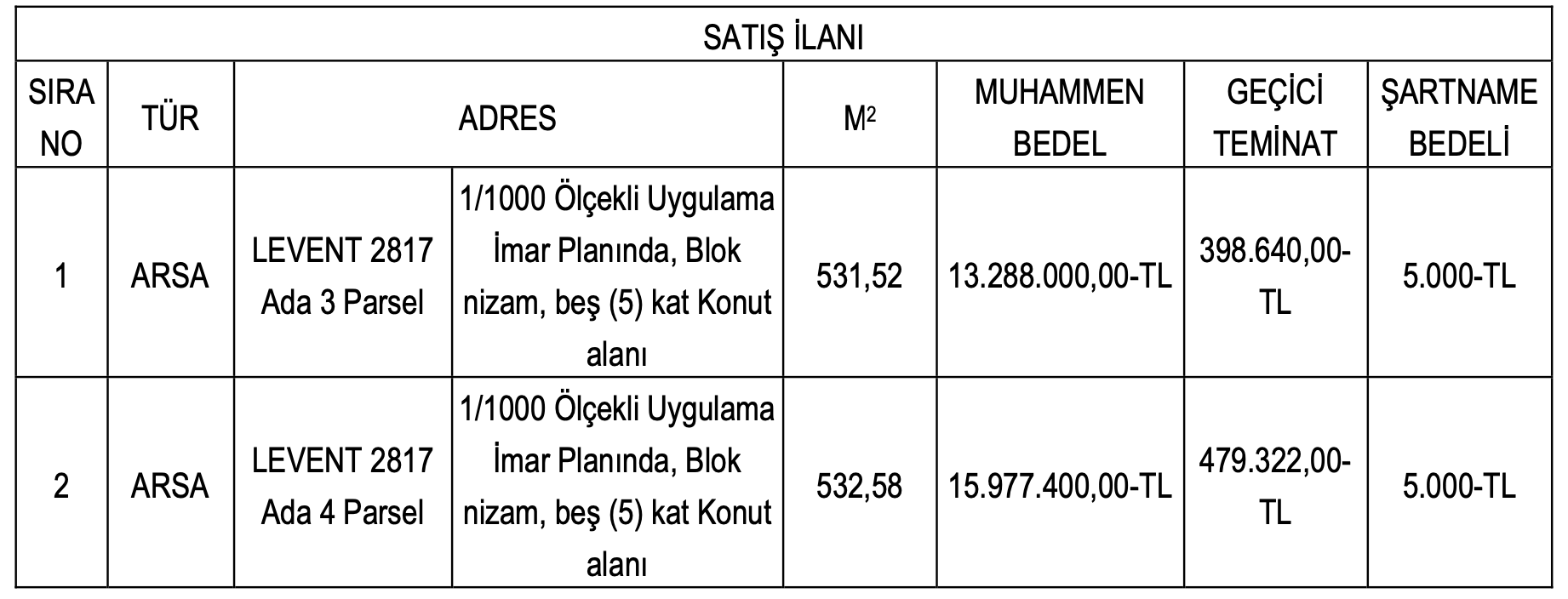 Konut alanı imarlı arsaların muhammen bedelleri 13 milyon 288 bin TL ve 15 milyon 977 bin 400 TL şeklinde belirtilirken, geçici teminat bedelleri ise 398 bin 640 TL ve 479 bin 322 TL olarak açıklandı.