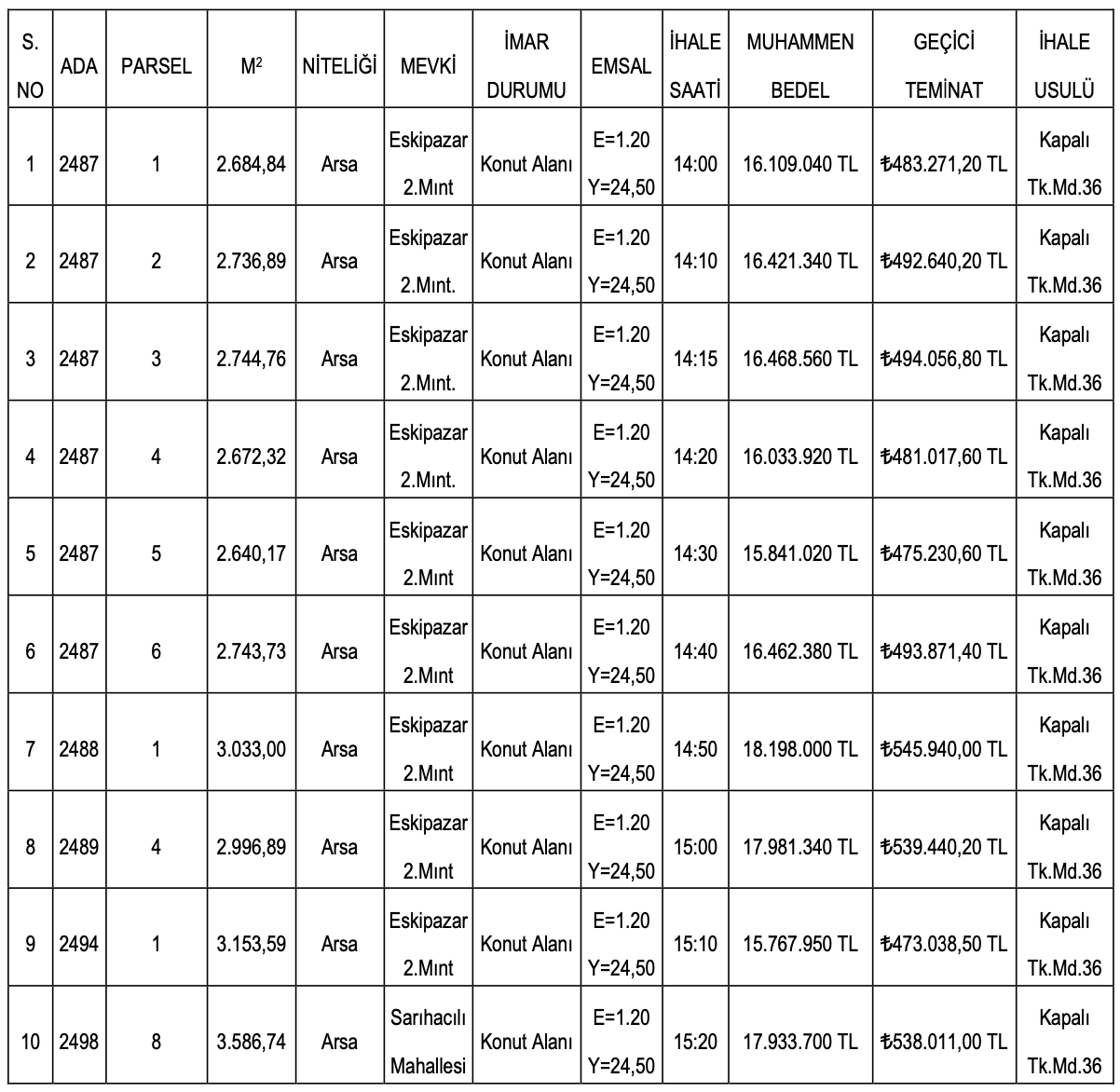 MADDE 1- Mülkiyeti Belediyemize ait aşağıdaki listelerde belirtilen 10 Adet Arsa 2886 sayılı Devlet İhale Kanununun 36. maddesine göre ( Kapalı Teklif Artırma ) her bir adedi hizalarında gösterilen saatte satılmak üzere ihaleye çıkarılmıştır.