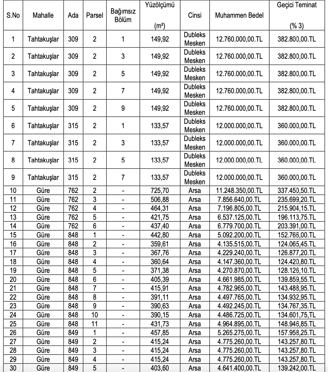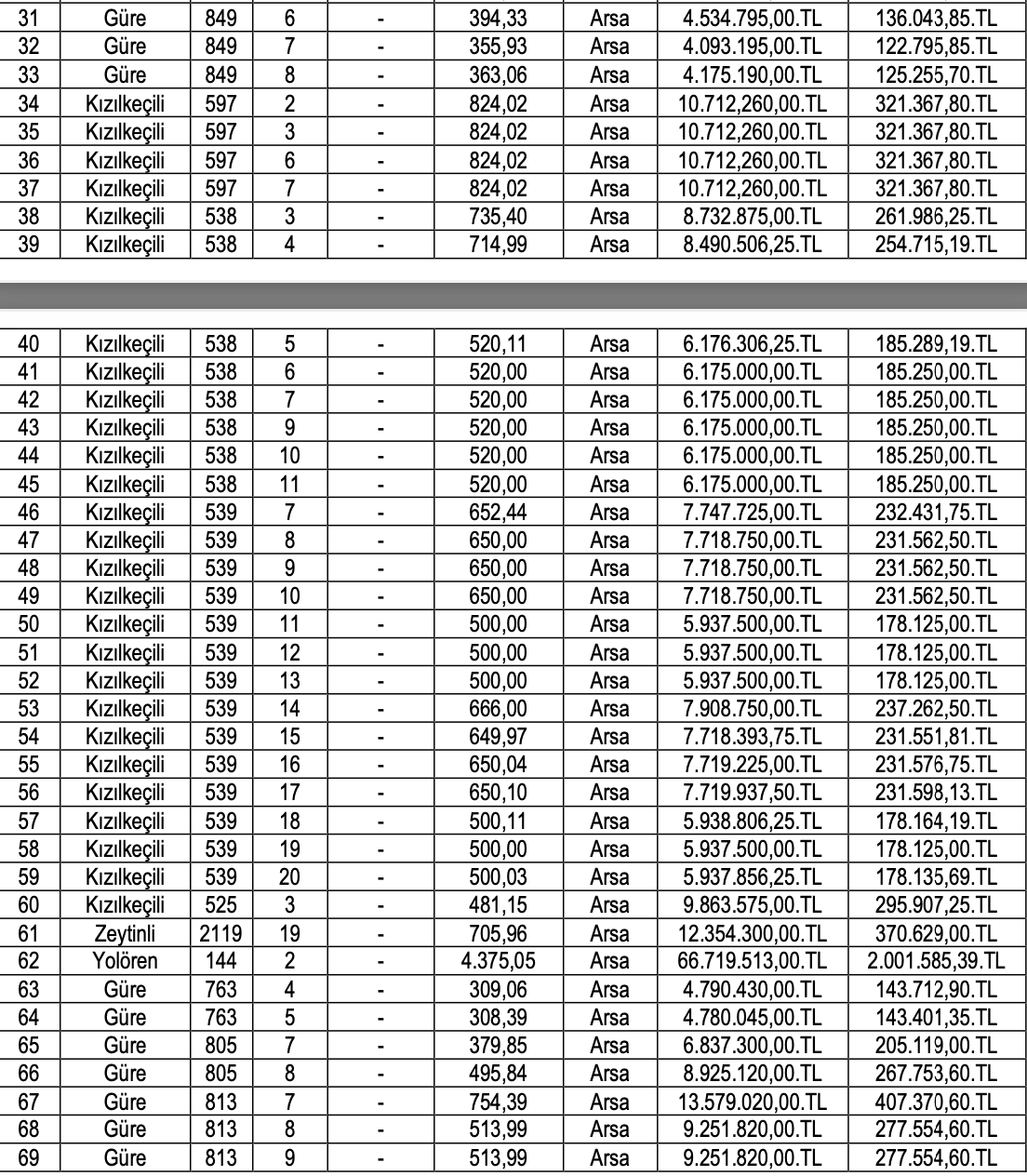 Arsaların ise en yüksek muhammen bedeli 66 milyon 719 bin 513 TL, en düşük muhammen bedeli 4 milyon 93 bin 195 TL olarak, en yüksek geçici teminat bedeli 2 milyon 1 bin 585,39 TL, en düşük geçici teminat bedeli 122 bin 795,85 TL olarak belirtildi.