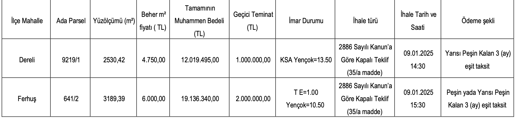 b) İhale Tarih ve Saati: 14.01.2025 Salı, saat 14.00’ de başlayacak olup, yukarıda ki tabloda belirtilen sıra numarasına göre ihale edilecektir.