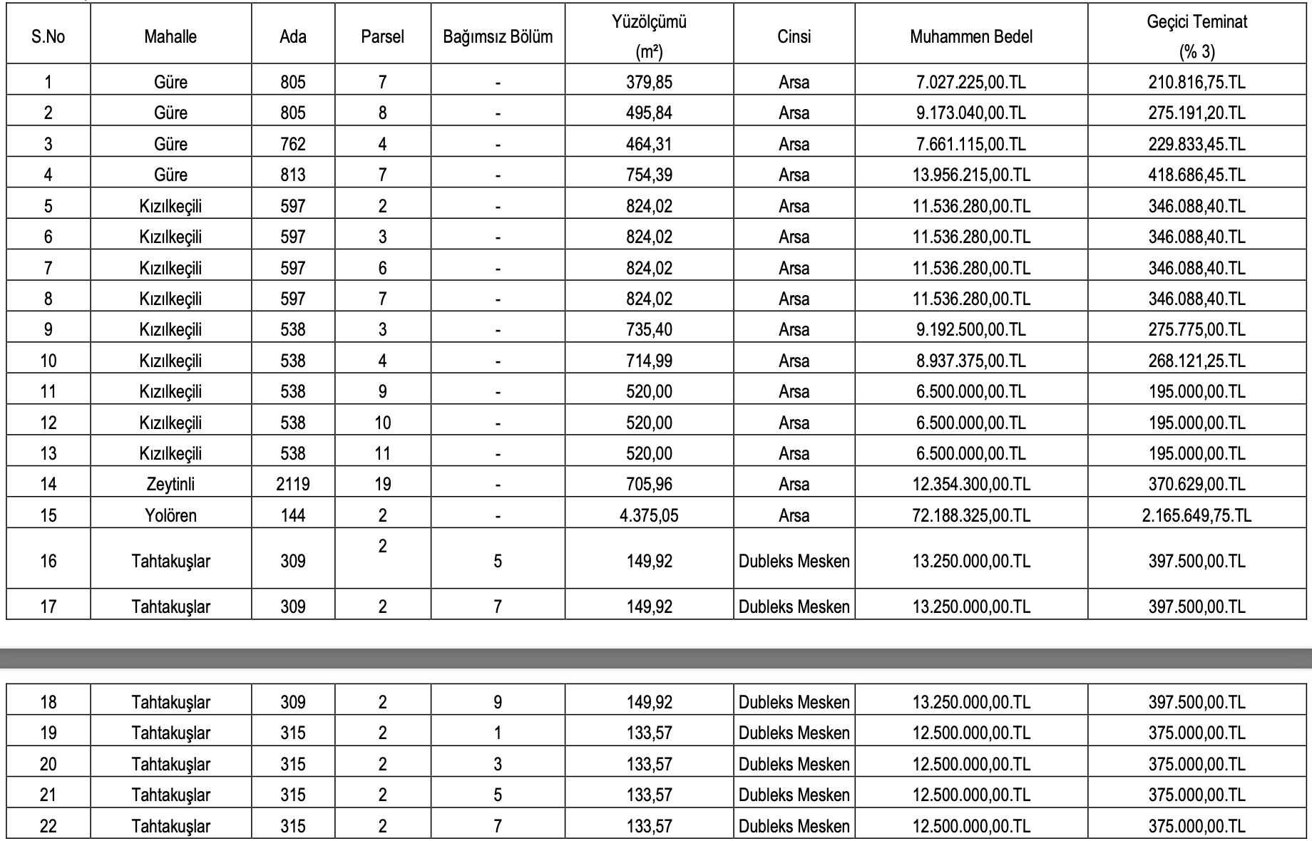 Satışa çıkarılan 22 adet gayrimenkulün yüz ölçümleri 133,57 metrekare ile 4 bin 275,05 metrekare arasında farklılık gösteriyor.