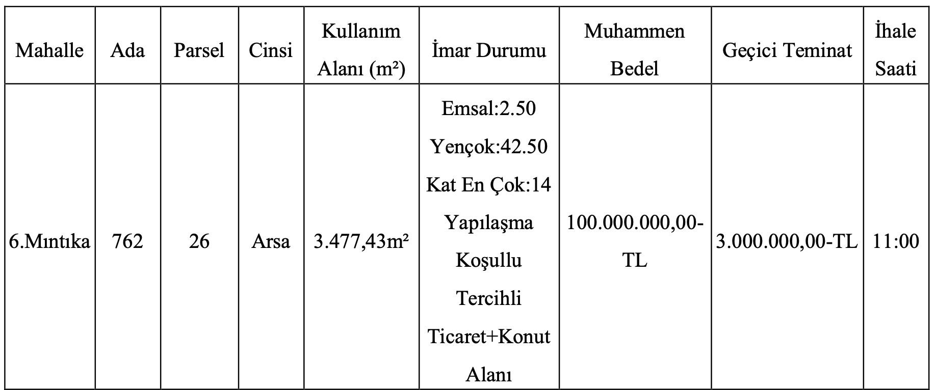 Manisa Turgutlu’da yer alan arsa 3 bin 477,43 metrekare alana sahip. Ticaret ve konut imarlı arsanın muhammen bedeli 100 milyon TL olarak, geçici teminat bedeli ise 3 milyon TL olarak açıklandı.