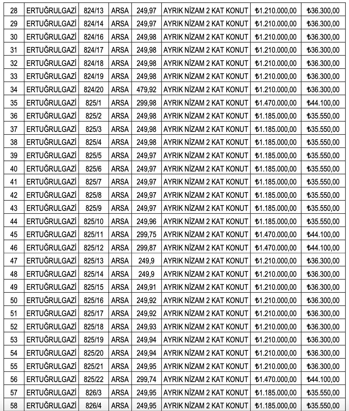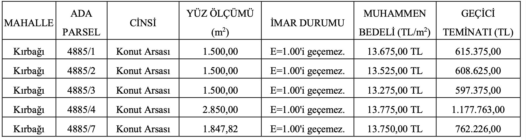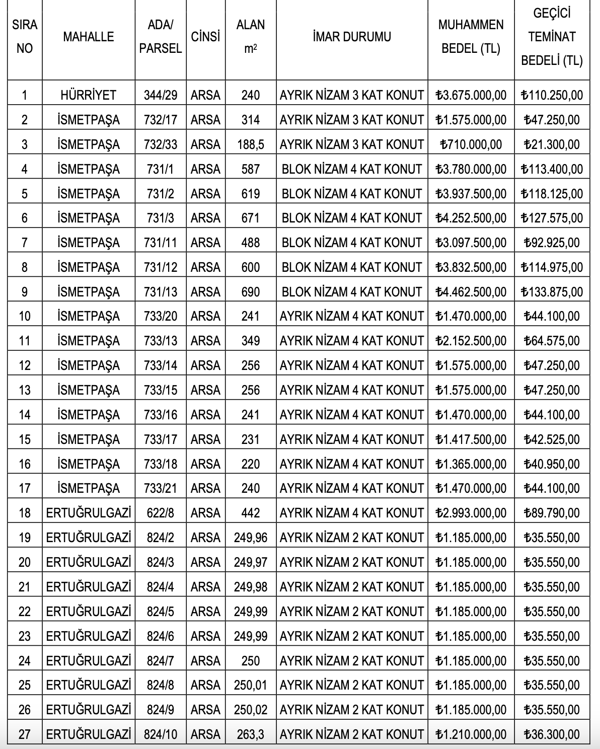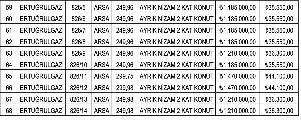 Arsaların muhammen bedelleri 13 milyon 275 bin TL ile 13 milyon 750 bin TL arasında değişirken, geçici teminat bedelleri ise 597 bin 375 TL ile 1 milyon 177 bin 763 TL arasında farklılık gösteriyor.
