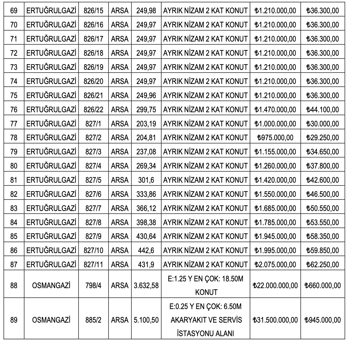 Bilecik’te yer alan 89 adet arsa konut ile akaryakıt ve servis istasyonu imarlı olarak belirtildi. Arsaların yüz ölçümleri 188,5