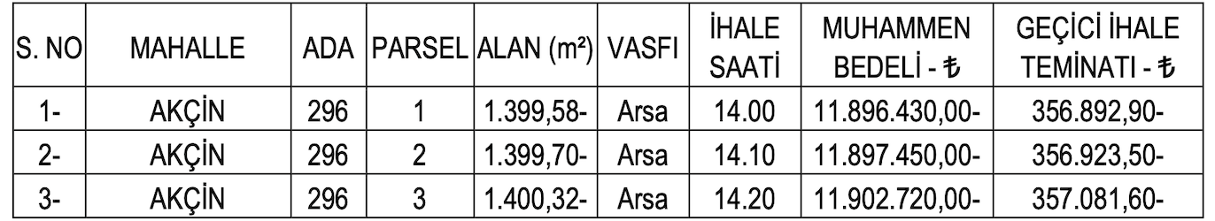 Muhammen bedellerin 11 milyon 896 bin 430 TL ve 11 milyon 902 bin 720 TL arasında değiştiği arsaların geçici teminat bedelleri de 356 bin 892,90 TL ve 357 bin 81,60 TL arasında farklılık gösteriyor.