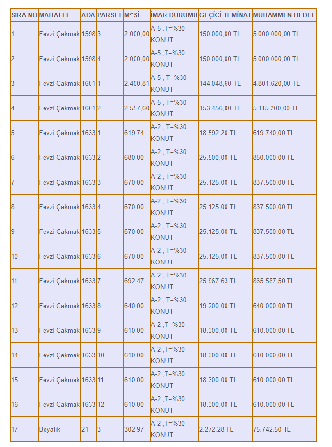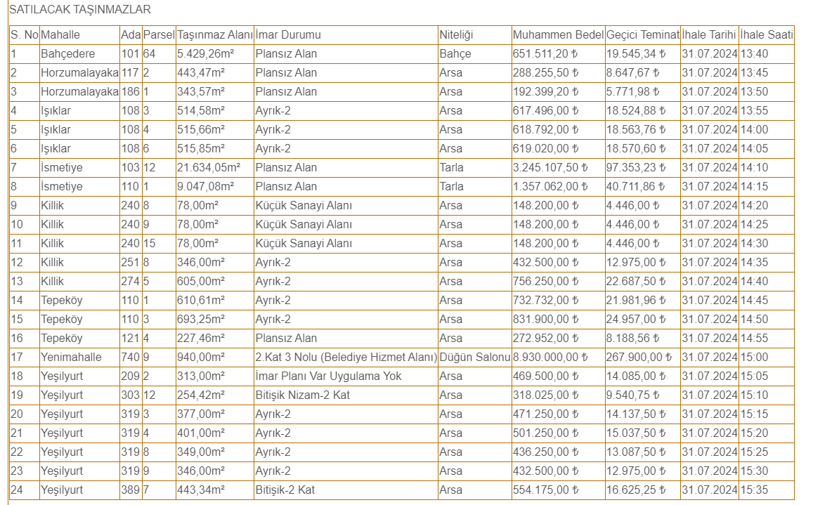 Çiçekdağı Belediyesi tarafından satışa çıkarılan ve Kırşehir'de yer alan arsaların ise muhammen bedelleri 75 bin 742 TL ile 5 milyon 115 bin 200 TL arasında değişirken, geçici teminat bedelleri ise 2 bin 272 TL ile 153 bin 456 bin TL arasında değişiyor.