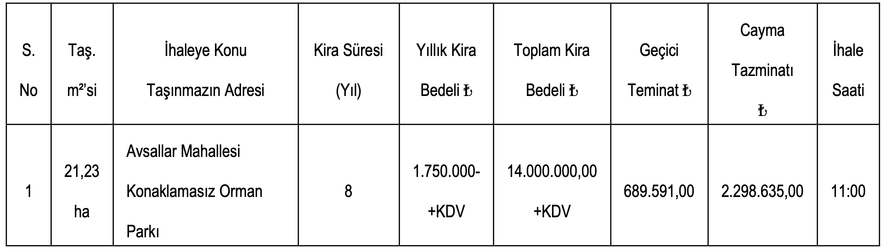1- Mülkiyeti Belediyemize ait olan aşağıdaki tabloda belirtilen taşınmaz kiraya verilmek üzere 2886 sayılı Devlet İhale Kanunu’nun 35/a. maddesi gereğince Kapalı Teklif Usulü ve kira bedeli artırımı yapılması suretiyle ihaleye çıkarılmıştır. Kiralanan alan ticari üniteler ile sınırlıdır.