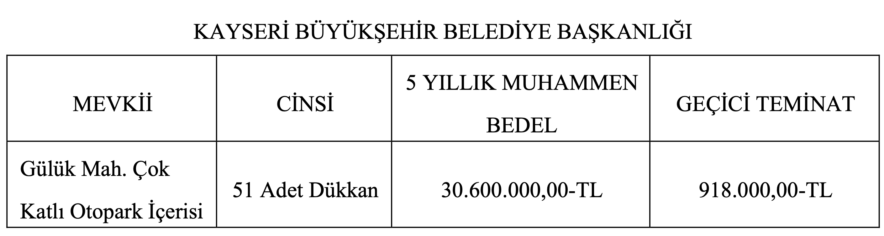 Kayseri Gülük Mahallesi’ndeki çok katlı otopark içinde yer alan 51 adet dükkanın 5 yıllık muhammen bedeli 30 milyon 600 bin TL, geçici teminat bedeli ise 918 bin TL olarak açıklandı.