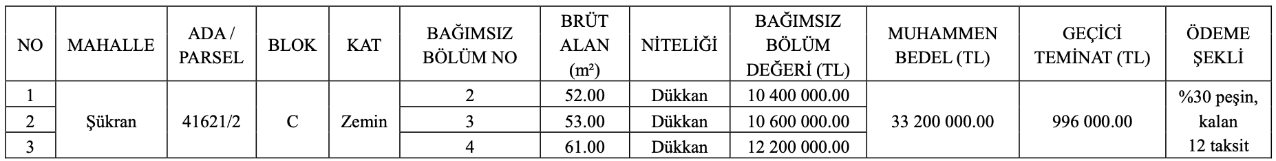 Muhammen bedelleri 10 milyon 400 bin TL ile 12 milyon 200 bin TL arasında değişen dükkanların toplam muhammen bedelleri 33 milyon 200 bin TL şeklinde belirtilirken, geçici teminat bedelleri ise 996 bin TL olarak belirtildi.